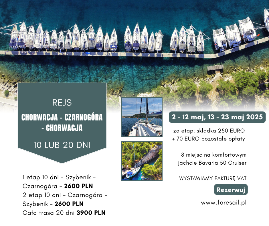 Cena nie zawiera: składki jachtowej - 250 Euro/osoba/etap przy pełnej załodze